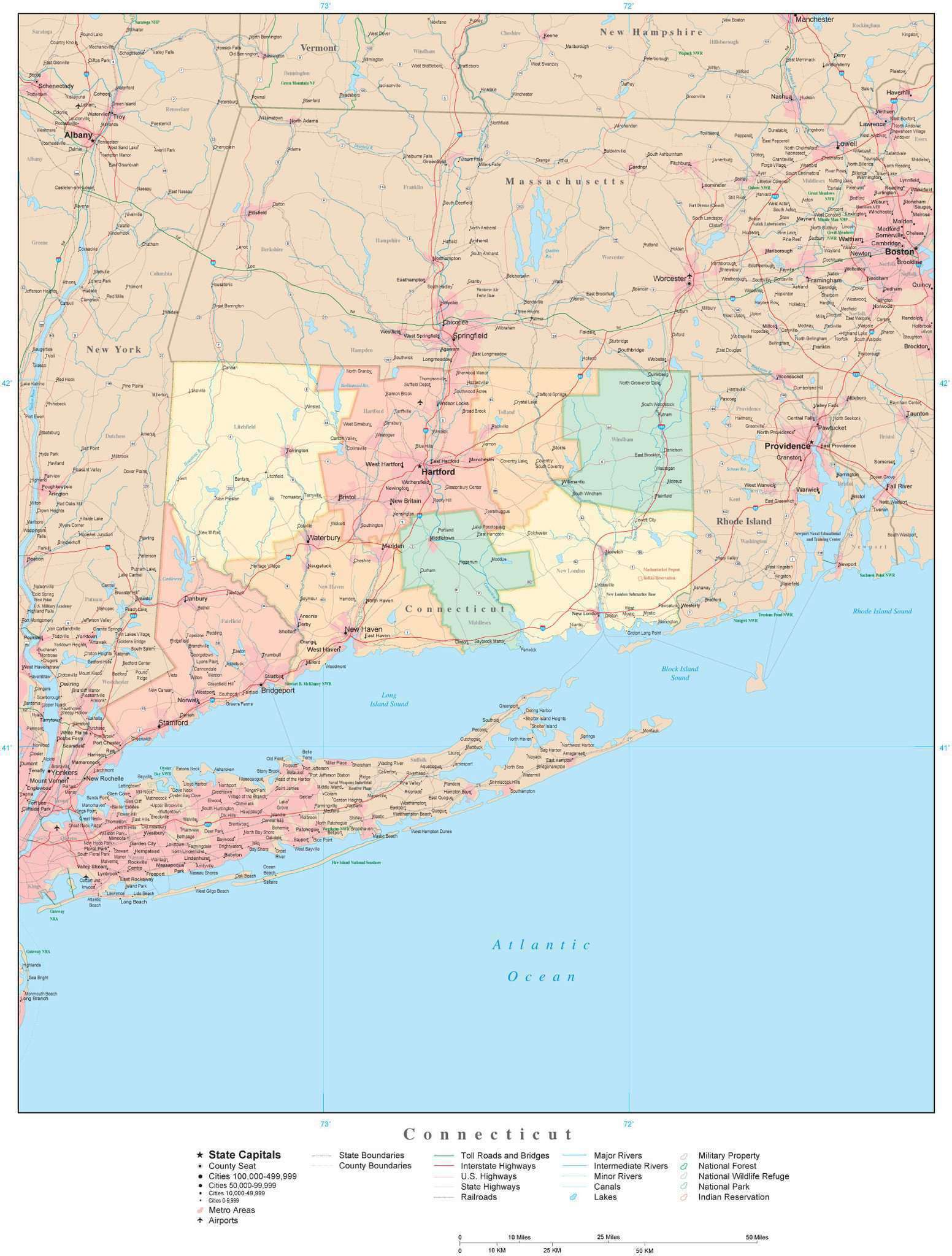 Connecticut Digital Vector Map with Counties, Major Cities, Roads