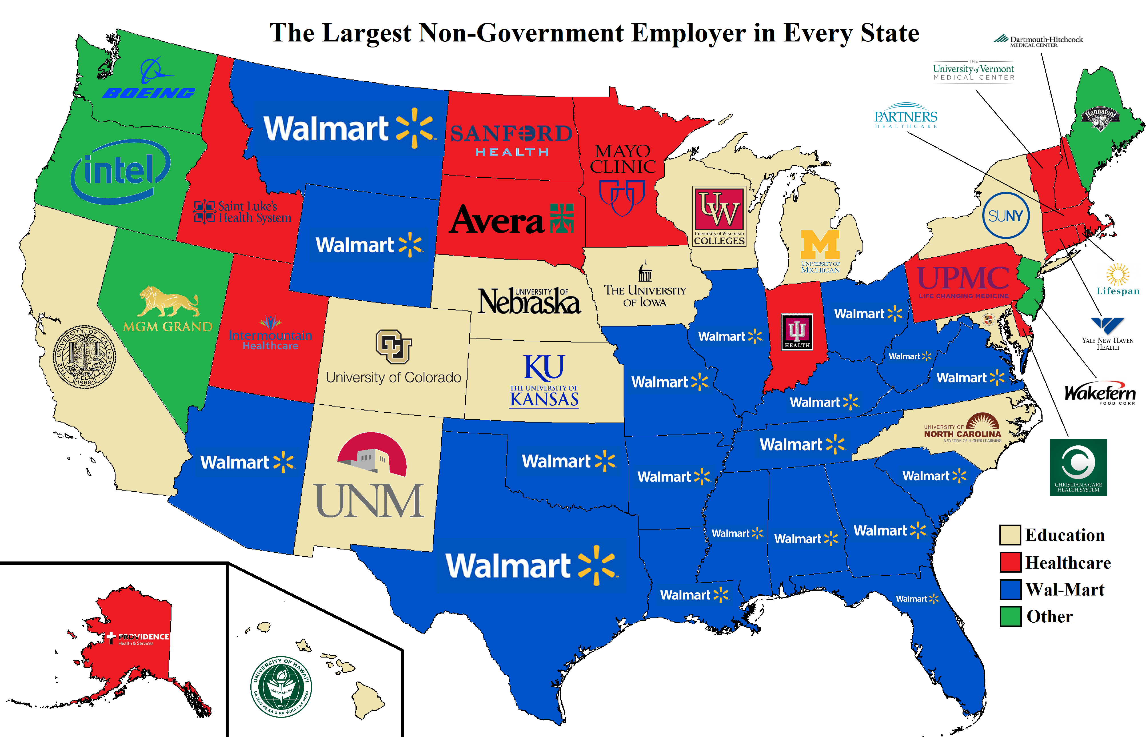 Largest Employer By State Map Walmart Nation: Mapping the Largest Employers in the U.S.: When it comes to learning about a new region of the world, maps are an interesting way to gather information about a certain place. But not all maps have to be boring and hard to read, some of them . SILVER BAY, Minn. — Even by North Shore standards, the stretch of undeveloped land along Lake Superior across the highway from the small city of Silver Bay is spectacular. Some 50 miles out of Duluth, .